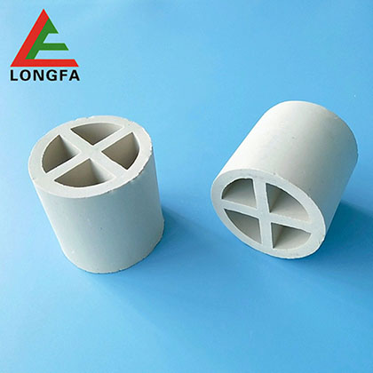 陶瓷十字隔板環(huán)填料也是基于增加填料的比表面以強(qiáng)化傳質(zhì)效率的想法之上而開發(fā)出來的,其結(jié)構(gòu)是在拉西環(huán)中增設(shè)了十字隔板。一般來講,這種填料由于尺寸較大,僅適用于整齊堆砌,目前一般只作為亂堆填料的塔底支撐分布層用。Φ80-150mm規(guī)格的十字隔板環(huán)可作支承材料,空隙率大于60%,個(gè)數(shù)為整聚數(shù)。
